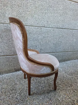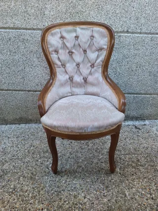 Se venden 2 elegantes butacas con estructura de madera y tapizado de tela, por 50€ cada una. - Diseño clásico. - Patas de madera tallada. - Acolchado confortable. - Madera en muy buen estado. - Tapizado a restaurar.