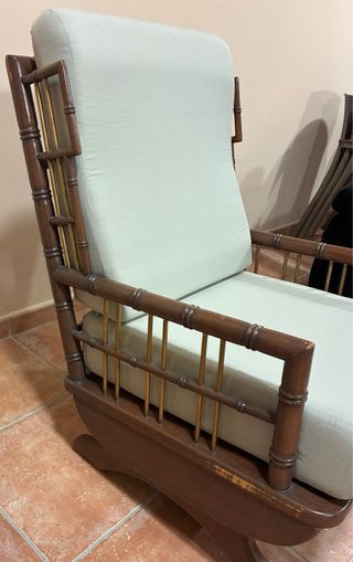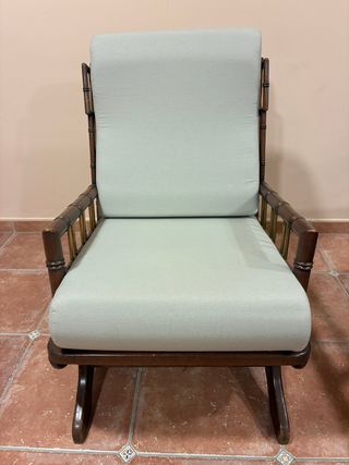 Acogedora butaca mecedora con un diseño clásico. - Estructura de madera oscura. - Cojines en tono beige claro. - Brazos y patas de madera.