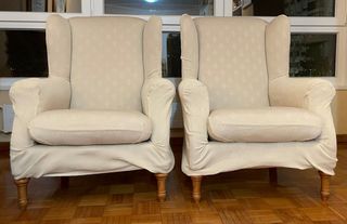 Par de butacas elegantes con estructura de madera y tapizado en tela. Se venden en conjunto o por separado 150 euros cada una. - Diseño clásico y confortable. - Patas de madera torneada.