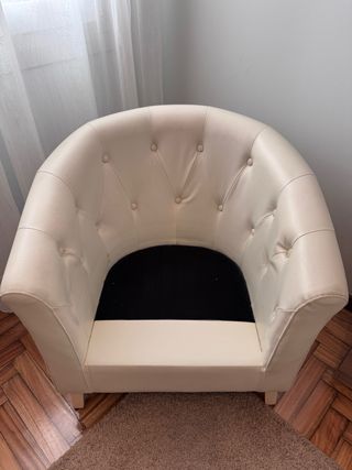 Elegante sillón individual de piel sintética en color blanco. Tiene marcas de uso pero se encuentra en buen estado. - Diseño clásico con botones. - Estructura robusta y cómoda. - Perfecta para relajarse y leer.