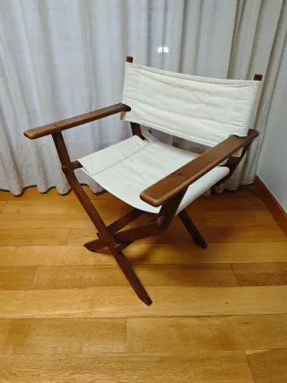 Butaca plegable de madera con asiento y respaldo en tela. - Diseño clásico y funcional. - Fácil de guardar y transportar.