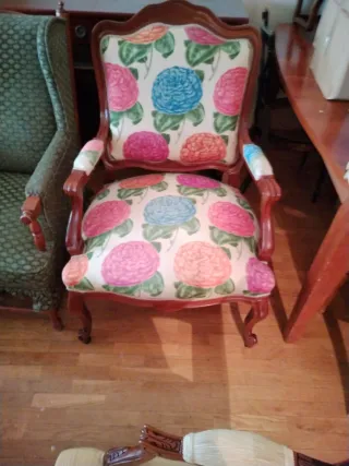 Butaca antigua con un diseño clásico y un tapizado floral. Patas de madera, tapicería de tela con estampado floral. Está bastante sucia, habría que lavarla. Por lo demás perfecta. Es baja, como para calzarse.