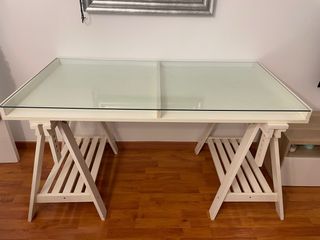 Mesa de escritorio IKEA con superficie de cristal opaco y estructura de caballetes de madera. - Medidas cristal: 150 cm de largo x 80 cm de ancho cristal liso opaco con esquina redondeadas. - Caballetes: altura de 70 a 93, madera lacado en blanco. - Diseño moderno y funcional. - Ver medidas exactas en fotos. - Solo entrega en persona.
