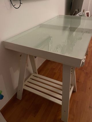 Escritorio con Caballetes de IKEA modelo MITTBACK EL precio es de los 2 con el cristal incluido. Está todo en perfecto estado. Cristal bastante grueso Elegante escritorio con superficie de cristal y estructura de madera. - Diseño moderno y minimalista. - Patas en forma de caballete para mayor estabilidad. - Estantes inferiores para almacenamiento adicional.