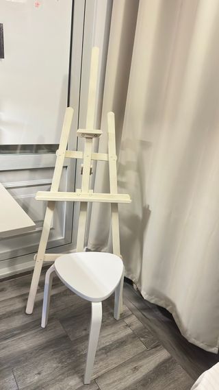Conjunto de caballete y taburete. - Caballete de madera pintado a mano. Altura 1,47m - Taburete de madera blanco de IKEA.