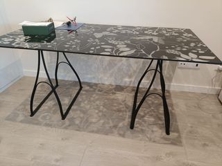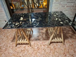 Mesa compuesta por cristal (IKEA) y estructura de madera (caballetes ) Cristal Medidas: Ancho: 73,5cm • Longitud: 148,5cm Como nuevo, sin marcas ni detalles. Caballetes de Bauhaus -Madera natural -Listo para usar -Ideal para trabajos de restauración -Refuerzo de apertura inferior (Nuevos = 17,89€ cada uno.) todo como nuevo, lo vendemos porque cambiamos la mesa.