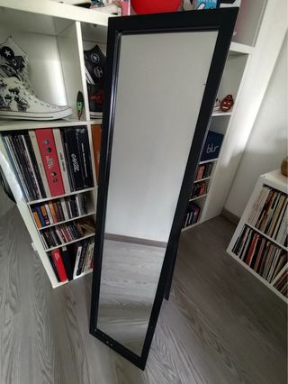 Elegante espejo de pie con marco de madera, negro Medidas 1,45 cm X 36 cm, 40 cm apertura caballete 40cm Está como en las fotos. Entrega en mano en Poblenou