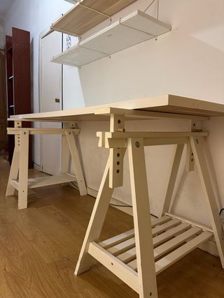 Mesa de estudio o trabajo con estructura de caballetes Mittback de Ikea, totalmente nueva sin estrenar. - Tablero de color blanco. - Estructura de madera. - Cestas de mimbre no incluidas