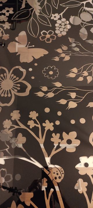 Mesa de vidrio templado con dibujos de flores y caballetes blancos de ikea. 150(ancho)x80(fondo)x70(alto)