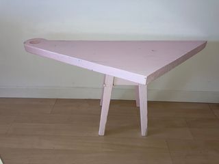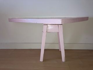 Mesa escultura. Edición única. Compuesta de dos elementos: tablero de madera noble procedente de sección de cabecero historiado y soporte de madera basta antigua banqueta de trabajo. Exterior de esmalte rosa. Medidas: 115x44x52
