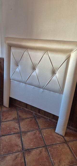 Precioso cabecero de aprox. 165cm apto para cama de hasta 150cm, en color blanco roto. Tapizado en piel, tiene un diseño elegante y moderno. - Ideal para darle un toque sofisticado a tu dormitorio. - Se encuentra en perfecto estado. - Listo para ser instalado.