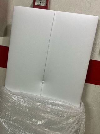 Cabecero de polipiel en color blanco. Presenta un diseño acolchado con divisiones cuadradas. - Diseño moderno y elegante. - Acabado liso y fácil de limpiar. - Solo tiene un par de cesconchados en un lateral...los que muestro en la foto.