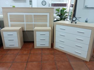 Conjunto de muebles de dormitorio en perfecto estado. Incluye cabecero, dos mesitas de noche y una cómoda. - Diseño moderno con acabado en madera clara y blanco. - Mesitas de noche con tres cajones cada una. - Cómoda con cuatro cajones amplios.