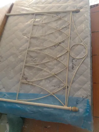 Cabecero de blanco para cama de matrimonio de 135cm. - Medida: 135cm. - Estructura de metal. - Color blanco crema crema SOMIER LAMINAS 135CM PATAS COLCHON 135CM×21CM (USO 6 MESES POR NIÑA DE 10 AÑOS) (tiene pequeña mancha en un lateral) RECOGER CABANILLAS DEL CAMPO Por separado Cabecero 50e Somier con patas llamas anchas 50e Colchón (prácticamente nuevo pero tiene una mancha en un lateral) 60e