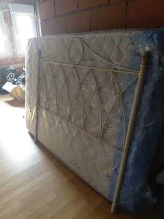 Se vende cama completa de 135x190 cm con cabecero. - Base de cama blanca. - Colchón con tejido de carbono activo. - Cabecero blanco acolchado.