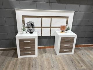 Conjunto de mesitas de noche y cabecero con un diseño moderno. - Acabado en madera y detalles en blanco. - Estructura con toques metálicos. Los muebles estan en Valencia. No se envian, solo recogida