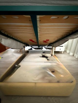 Estructura de cama de matrimonio con un diseño clásico y elegante. - Marco de metal resistente. - Cabecero con detalles ornamentales. (Falta un lado) - Acabado en color blanco. -Incluye colchón de 140 (tiene una mancha de lejía pero con el cubre colchón, no se ve) - 140 de ancho x 200 de alto