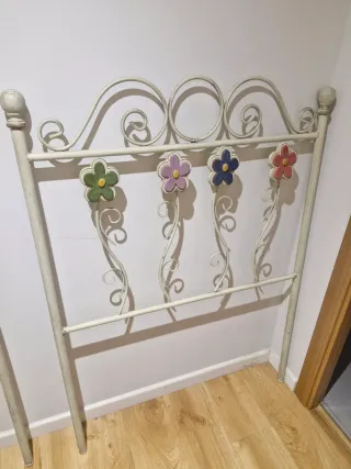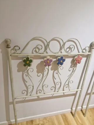 Juego de 2 cabeceros de cama 90cms, de hierro en color blanco, con un diseño encantador de flores. - Estructura de metal. - Decorado con flores de colores: verde, lila, azul y rojo. - Diseño curvo en la parte superior.