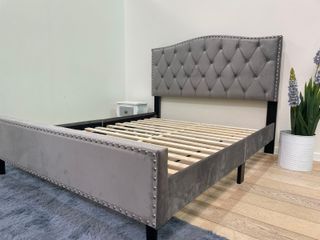 ☎️680*558*196 Cama matrimonial nueva con cabecero tapizado en color azul terciopelo. Características principales: ✅ Tamaño: Cama matrimonial (135/150 cm aprox.) ✅ Estado: Nueva, sin uso y aún con el plástico protector ✅ Cabecero acolchado capitoné con diseño moderno y elegante ✅ Estructura robusta y duradera ✅ Color gris azulado .