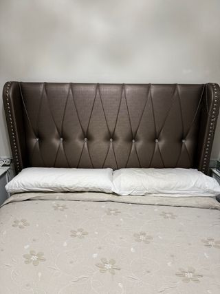 Cabecero de polipiel con un diseño capitoné moderno. Aporta un toque elegante a cualquier dormitorio. Precio original 480€ - Medidas: 1,5 metros de ancho por 1,2 metros de alto. - Acabado en polipiel de color marrón.