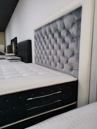 NUEVA SIN ESTRENAR DE TIENDA !!Elegante cama de diseño, completamente nueva y lista para darle un toque especial a tu habitación. Su estilo moderno y acabados de calidad la hacen una pieza única. - Cabecero alto con capitoné. - Base de cama con diseño capitoné. - Tapizado en tela de terciopelo antimanchas . Medidas 150 x 190 cm opcion de añadir colchon y canape