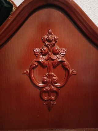 Precioso cabecero de estilo clasico hecho en madera torneada y lacada, ideal para camas de 135 cm. Se encuentra en perfecto estado. - Diseño clásico y elegante con detalles tallados. - Color marrón cálido y acabado brillante. - Perfecto para añadir un toque de sofisticación a tu dormitorio.