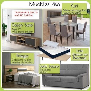 *** 🚚 ENVIO GRATIS 🚚==>>SOLO PARA MADRID CAPITAL Y HASTA 25 KM***💰PAGO CONTRAREEMBOLSO 💰***WHATSAPP 655 666 333* Cambia los muebles de tu piso ahorrando mucho tiempo y dinero. Este lote de piso completo contiene una composición de salón Soto 180cm, conjunto con mesa rectangular y 4 sillas, un sofá de 2 plazas, un lote de descanso 135X190 y cabecero con dos mesitas de noche. Muebles kit ,viene totalmente desarmados ,menos la base tapizada y el sofa. Tenemos que informar que el transportista entrega su pedido en la puerta de su casa o edificio. Por tanto está exento de subir o trasladar los productos comprados.