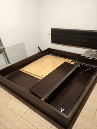 Estructura de cama de matrimonio japonesa con un diseño moderno y funcional. - Dimensiones: 200x180 cm. - Acabado en tonos oscuros y detalles en madera clara. - Incorpora un sistema de elevación para almacenamiento. Regalo el cabecero negro de polipiel junto con la estructura. La vendo hasta el 30 de Enero, después ya no la tendré disponible. Sería recogida en Alicante y se entrega desmontada.