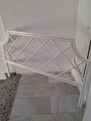 Cabecero de resistente estructura elaborado a mano con caña de bambu. Pintado y lacado en blanco. No pesa demasiado. Muy decorativo, para cama de matrimonio. Largo 1'60. Alto 1'04. Con señales normales del uso, buen estado en general. 39€€. Recoger en Marbella.