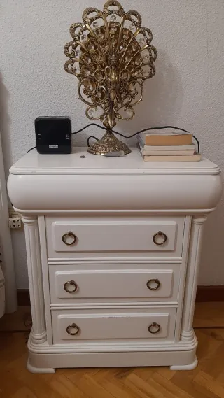 Se vende dormitorio de matrimonio completo en color blanco. Conjunto clásico/neoclasico elegante y de calidad. - Cama de matrimonio 135 cm en madera maciza lacada en blanco, tapizada con diseño floral. - 2 mesillas con 3 cajones. -1 Sinfonier 6 cajones. -1 Cómoda con 4 cajones y espejo. -2 Butacas estilo colonial en madera y bambú, respaldo en rejilla y respaldo y asiento tapizados en tela a juego con cabecero. -1 Galán de noche con cajón inferior. No pierdas la oportunidad de adquirir un mobiliario de alta calidad, elegante y a muy buen precio. Urge vender.