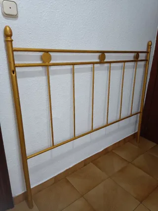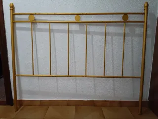 Cabecero de hierro forjado con un diseño clásico y elegante. - Para cama de 135 cm - Acabado en color dorado. - Estructura metálica resistente. - Detalles decorativos circulares en la parte superior. - Estaba puntada en color azul, luego se pintó en color dorado pero no quedó bien pintado (ver última foto) - Buen estado WhatsApp o Llamadas 614.24.46.20