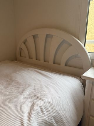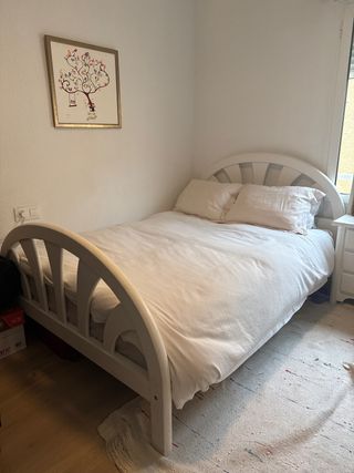 Vendo estructura de cama matrimonial para colchón de 135 x 190 cm, en color blanco, incluye colchón. La cama originalmente era de madera en color natural, pero nosotros la lacamos en blanco a mano con brocha, por lo que el acabado es artesanal (no lacado industrial). Aun así se ve bonita y está en buen estado. Tiene un diseño clásico con cabecero y piecero curvados, ideal para dormitorio de invitados, habitación juvenil o piso de alquiler. 📏 Medida: para colchón 135 x 190 cm 🛏 Incluye colchón 🎨 Color actual: blanco (lacado a mano) 🪵 Material: madera Cama sólida, estable y lista para usar.