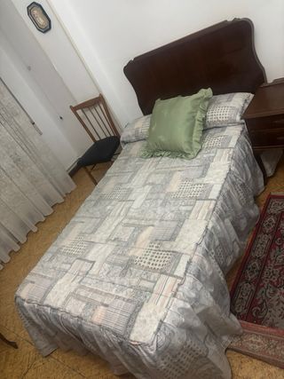 Se vende conjunto de mobiliario para dormitorio. - Una cama individual de 90cm con cabecero de madera. - Una mesilla de noche de madera con cajones. - Un espejo de pared con marco de madera. - Un armario de madera con cajones.