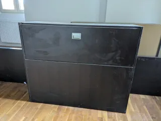 Cabecero de cama con almacenaje para cama de 1 metro de ancho. Tiene mucho espacio de almacenaje. En la foto parece negro pero es madera marrón oscuro. Medidas: - 1 metro de ancho - 33 cm de profundidad - 82 cm de alto