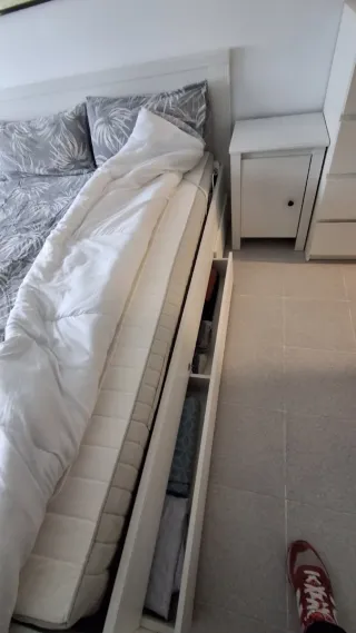 Vendo cama de matrimonio IKEA de 160 x 200 cm en excelente estado. Incluye todo el conjunto: ✔️ Estructura IKEA con cajones de almacenaje ✔️ Colchón IKEA ✔️ Cabecero IKEA a juego ✔️ Todo en color blanco Diseño moderno, muy funcional y resistente. Cama limpia, bien cuidada y lista para usar, tal como se ve en las fotos. 📐 Medidas: 160 x 200 cm 📍 Ubicación: Badalona 🛠️ Se puede desmontar 🚚 Recogida a cargo del comprador 💰 Precio: 450 € (negociable) 📩 Respondo rápido.