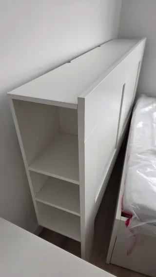 Cabecero de cama de 140 cm con compartimentos de almacenaje integrados. - Diseño moderno y funcional. - Acabado en blanco. Solo tiene 5 meses de uso. Pongo imágenes de referencia de Ikea de las medidas y como es completo. Ahora mismo esta desarmado y guardado en un trastero, con lo cual puedes buscarlo facilmente.