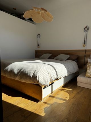 Cama MANDAL de Ikea con cajones para almacenaje y cabecero de listones de madera.