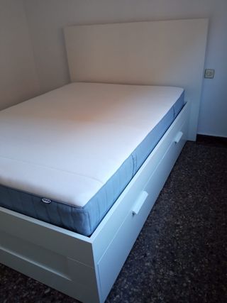Cama de matrimonio de IKEA con gran capacidad de almacenaje en perfecto estado. - Medidas: 140x200cm. - Color: blanco. - Estructura de madera. - 4 cajones. - Incluye cabecero. - Incluye somieres de láminas. - El colchón se puede incluir y el precio sería 120€.