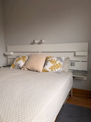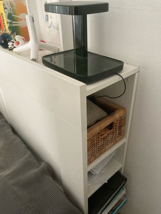 Cabecero con mesillas y bandejas integradas que se pueden colocar a cualquier altura, a tu gusto. Ver medidas en las fotos. Se incluye lámpara ideal para orientar y leer en la cama. Se vende por cambio de mobiliario y se entrega en persona. Con tapete de fieltro en las mesillas y almacenaje.