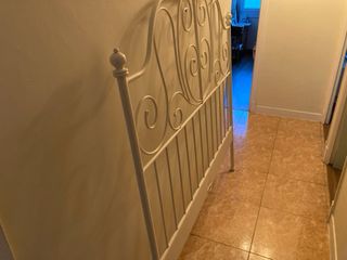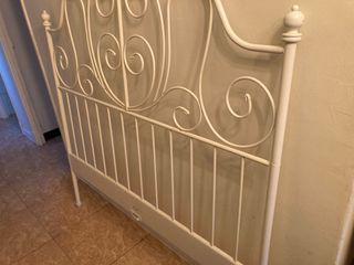 SOLO ESTÁ SEMANA Por falta de espacio vendo cama matrimonial Estructura de cama de metal con un diseño romántico y detalles ornamentales. - Acabado en blanco. - Diseño de cabecero curvo con volutas. - Ideal para un dormitorio con encanto. el ancho son aproximadamente: 140 cm 145 cm de alto ( contando desde el suelo hasta el tope de la cabecera ) 204 cm aprox de largo