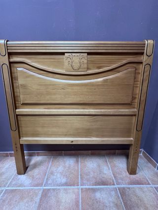 Cabecero de madera de pino para cama individual. - Diseño clásico con detalles tallados. - Acabado en tono miel natural. - Ideal para habitaciones infantiles.