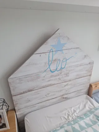 Cabecero de madera con un diseño único para habitación infantil. Presenta un acabado en blanco envejecido y detalles en azul. - Forma de casa con estrella. - Nombre Leo pintado a mano. - Ideal para dar un toque personal a la habitación.