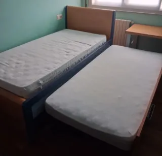 Dormitorio infantil juvenil completo en perfecto estado. - Armario modular con 3 puertas y 5 cajones. - Armario modular de 2 puertas, cabecero y arcón de gran capacidad. - Cama con arrastre de 90cm, la principal con somier compacto de tejidos transpirable y ventilación, y el arrastre con somier de lamas. - Colchón de 80cm incluido. - Escritorio a juego integrado, plegable, casi no ocupa espacio. - 2 estanterías de pared a juego. - Tocador blanco y dorado, con espejo y cajones. - Tanto tejidos con madera en perfecto estado. - Acepto ofertas.