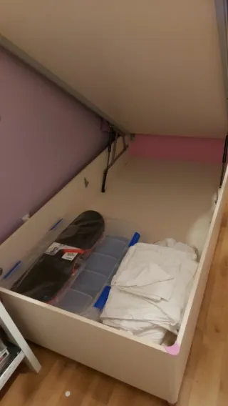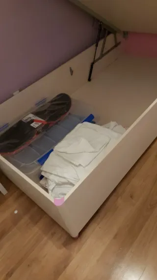 Canapé infantil de 90x190 cm. Ideal para almacenar objetos. Está en muy buenas condiciones. Lo vendo porque a mi hija se le ha quedado pequeño de longitud. Medidas 198x95x40 cm3. Alto cabecero 70cms desde la base de la cama. Se vende sin colchón. No envío. El transporte por parte del comprador (por eso es tan barato). El edificio tiene ascensor grande y es un segundo. El cabecero lo remoledé yo ya que era rosa originalmente. Quien se lo quede tiene que encargarse de desmontar si es necesario y llevarselo.