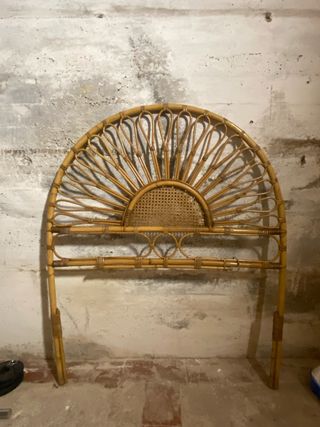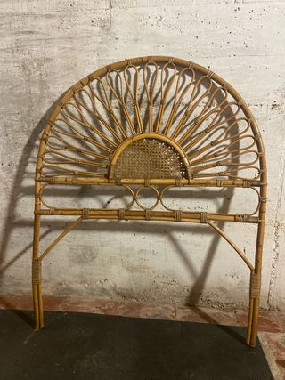 Cabecero de estilo bohemio, perfecto para darle un toque natural a tu habitación. Para cama de 135/150 cm. Original de los años 80, se conserva relativamente bien con un par de elementos dañados (ver fotos). Solamente venta en persona. Se hará descuento si se compran más piezas del set. - Diseño semicircular con detalles de ratán. - Estructura de bambú y mimbre. - Acabado natural.