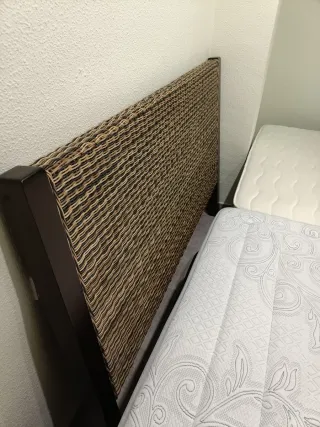 Estructura de cama de madera con cabecero de mimbre tejido. VACIADO DE PISO. - Diseño rústico y elegante. - Materiales de madera y mimbre. - Color marrón. SE VENDEN DOS IGUALES, UNA DE ELLAS CON SOMIER. PRECIO POR CADA UNA.