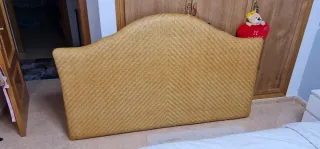 Cabecero de cama en perfecto estado, con un diseño moderno y elegante. - Tapizado en tela. - Estructura de madera. - Base de mimbre.