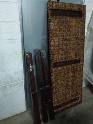 Se venden dos cabeceros de cama con un diseño elegante y natural. Precio cada una. - Estructura de madera oscura. - Panel central de mimbre tejido.