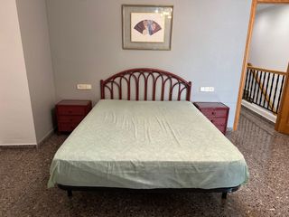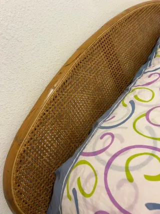 Bajada de precio por mudanza!!! Cama completa 135x190 cm. Colchón Pikolin muelles modelo 600 (buen estado, firme), base de madera con patas, cabecero de mimbre alto curvado y mesita a juego. Ideal para dormitorio boho o rústico