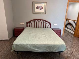 Cama Matrimonial con cabecero y mesita de mimbre.